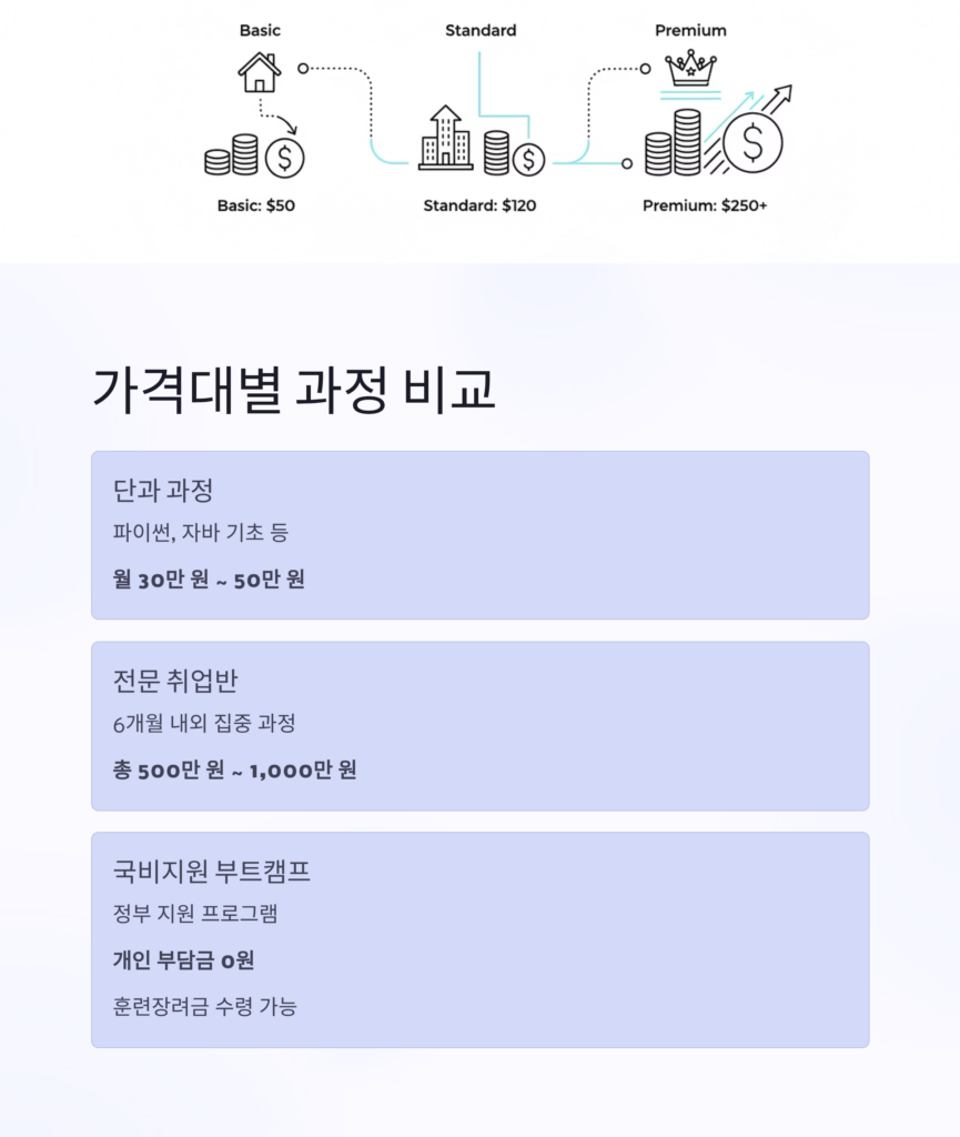 • 단과 과정 (파이썬, 자바 기초 등): 월 30만 원 ~ 50만 원 선