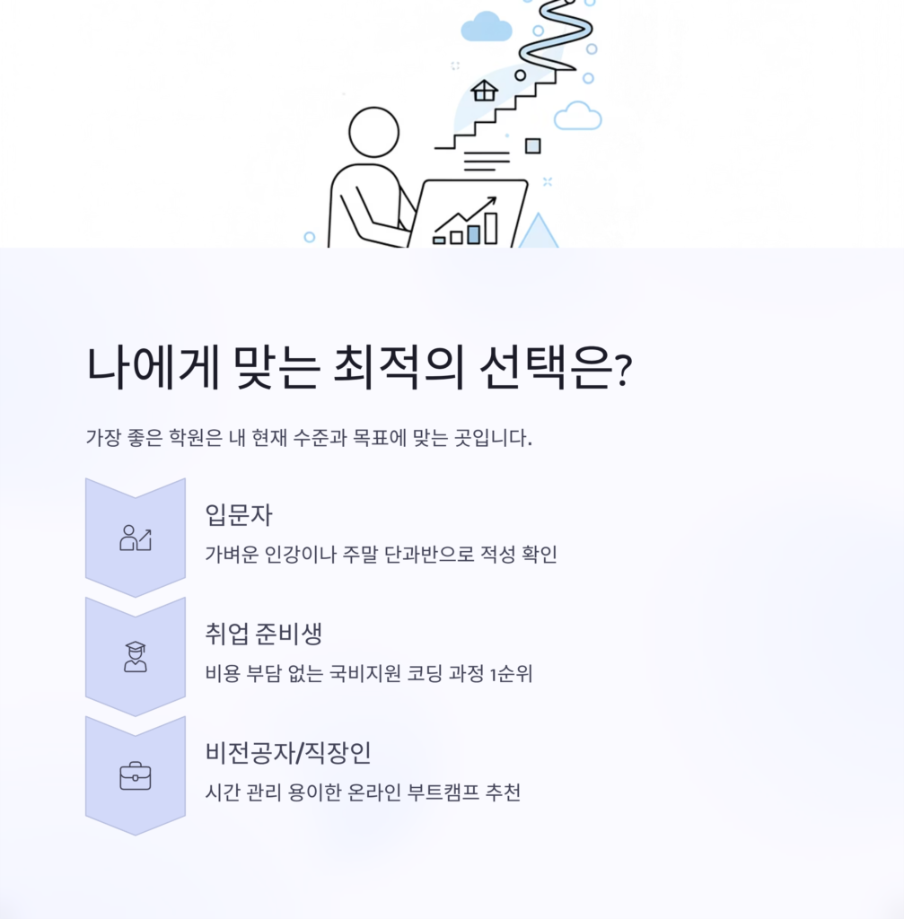 2. 취업 준비생: 비용 부담이 없는 국비지원 코딩 과정을 1순위로 고려하세요.